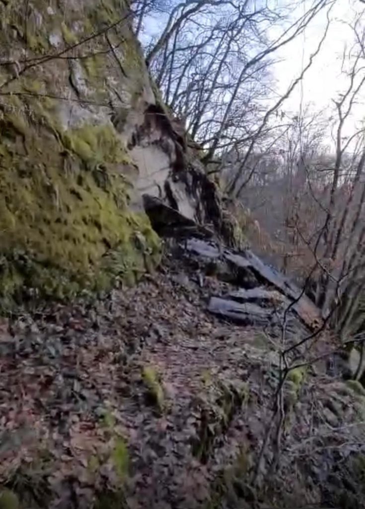 Auf dem WW-Steig nahe Helmeroth in Richtung Mörsbach (Mörsbach entlang Nister auf der Mörsbacher Seite) sind große Felsbrocken vom Steinhang auf den Weg gefallen. Ein besonders großer Brocken blockiert aktuell den Weg.